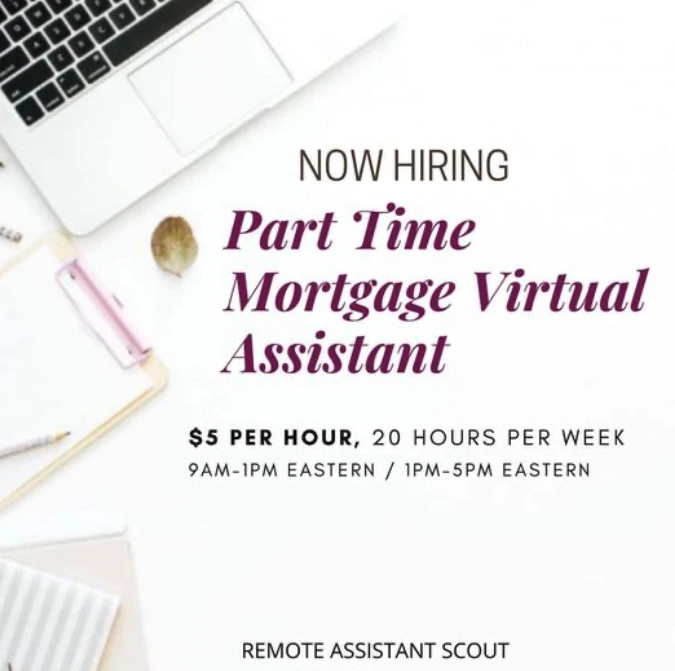 Now Hiring Part-time Mortgage Virtual Assistant ($5 per hour, 20 hours per week)
